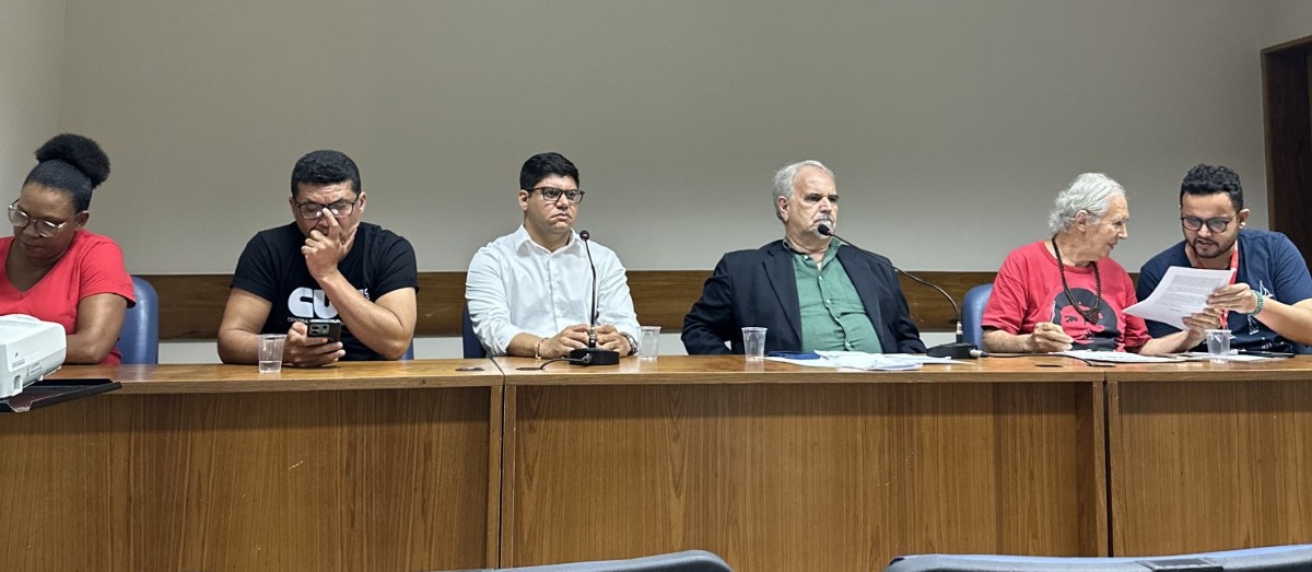 Compuseram a mesa: Ivoneide Assunção, do setor de cultura do Movimento dos Trabalhadores Rurais Sem Terra (MST) Seção Bahia; Adelmo Andrade, da Central dos Trabalhadores e Trabalhadoras do Brasil (CTB); Orlando Pereira, da Central Única dos Trabalhadores (CUT); Rafael Lopes, representando a Cáritas e o Sindicato dos Jornalistas Profissionais no Estado da Bahia (Sinjorba); Eric Pereira, da Rede MIDICOM- Rede de Mídias Comunitárias de Salvador; e Jonicael Cedraz, do Comitê Bahia do Fórum Nacional pela Democratização da Comunicação (FNDC). – A Bahia é o único estado que possui na sua constituicao um artigo que fala sobre o direito a comunicação.